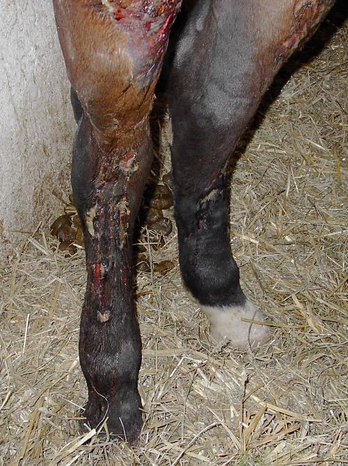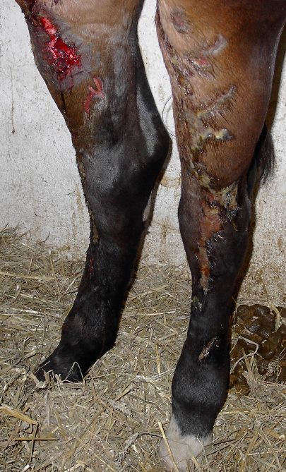 Das Pferd wurde mit einer Pferdedecke auf die Koppel gebracht und hierfür durch ein Koppeltor geführt. Das Stallpersonal hatte das Koppeltor leider nicht weit genug geöffnet, um das Pferd problemlos hindurchführen zu können. So passierte es, dass sich die Kreuzbegurtung der Pferdedecke an den Metallrohren des Koppeltores verhakte. Dies wäre kein Problem gewesen, wenn die Kreuzbegurtung daraufhin abgerissen wäre. Man hätte diese einfach wieder annähen können. Die Kreuzbegurtung war jedoch so bombenfest genäht, dass das Pferd regelrecht ans Koppeltor gefesselt war mit der Folge, dass es sich schwer verletzt hat. Die Folgen dieser Aktion sehen Sie auf den folgenden Bildern: